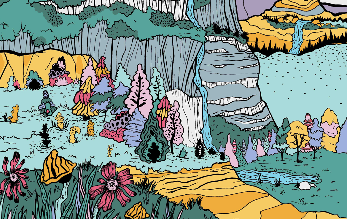 A stylised 2D cartoon illustration of a colourful landscape environment.