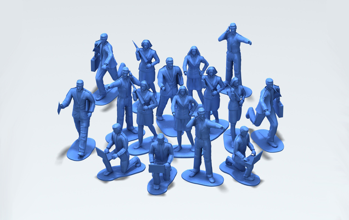 CGI Illustration of a group of financial bankers rendered in the style of the classic plastic toy army soldiers.